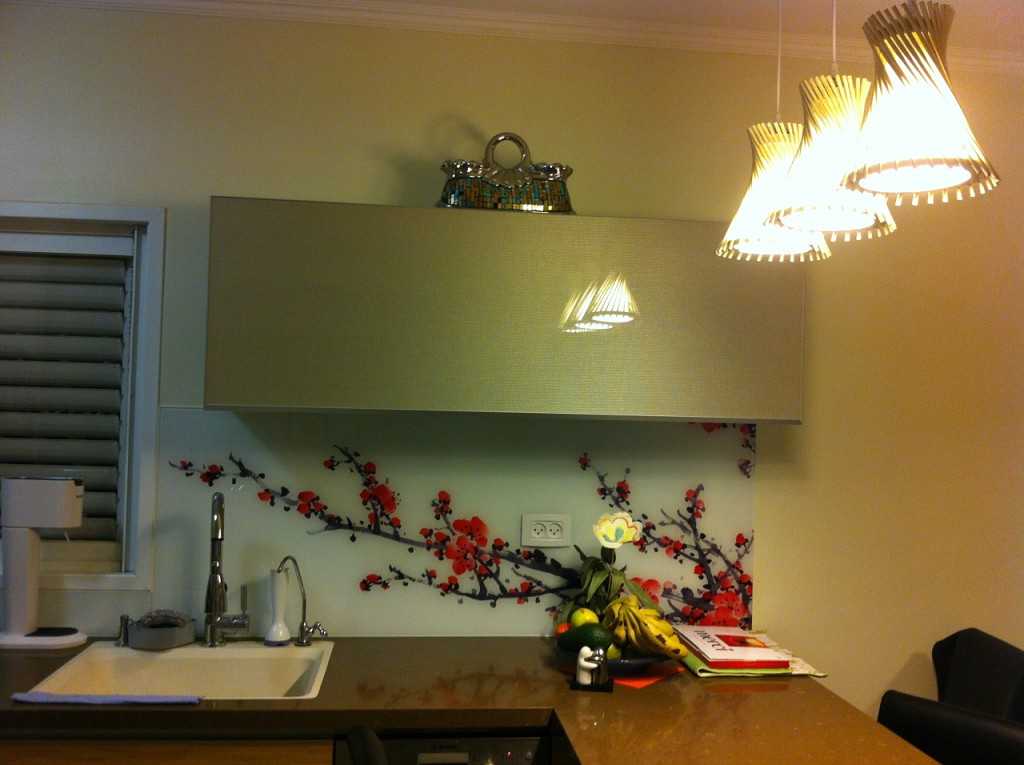 Ламинированное стекло, или триплекс, состоит из нескольких слоев. Два слоя могут быть изготовлены из сталинита, оргстекла или обычного стекла, а между ними расположен ламинирующий слой. Для фартука ламинирующий слой имеет рисунок. Такие фартуки очень тяжелые, так что крепить их на клей не получится. Придется использовать дюбели, а стена должна быть достаточно прочной, чтобы выдержать значительный вес.