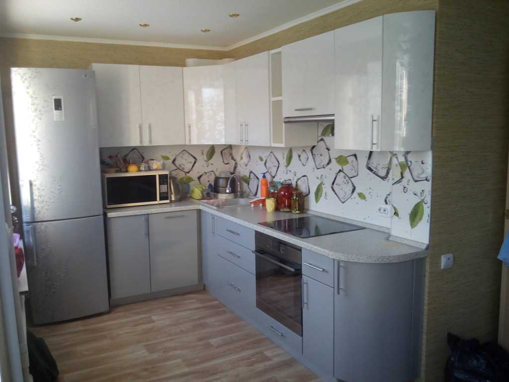 Разбавить серую кухню можно, используя яркое стеклянное полотно с узорами