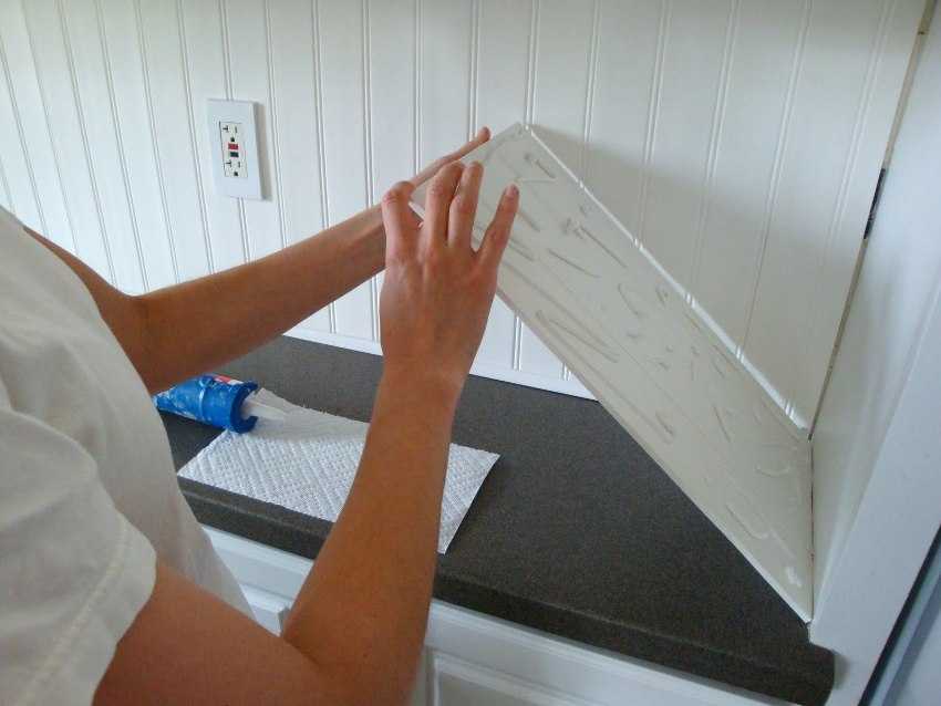 Технология установки фартука на клей предельно проста — главное в процессе работы точно выровнять все элементы и максимально совместить стыки соседних панелей