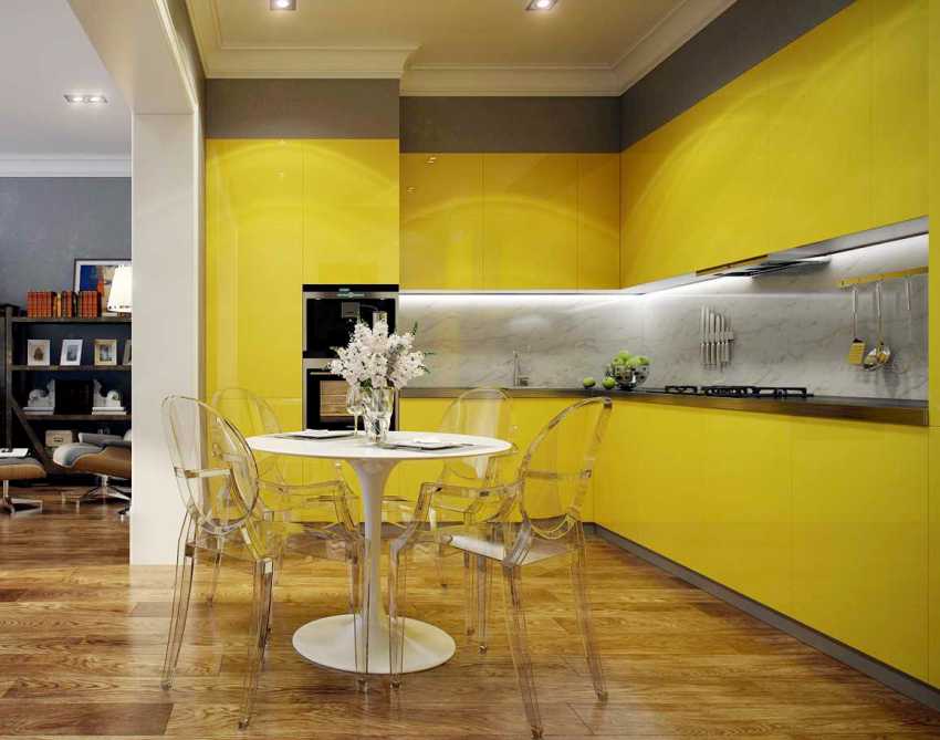 Серая кухня обычно прерогатива современных интерьеров. Его спокойствие и нейтральность позволяют отпустить полет фантазии на свободу и сделать скинали акцентом помещения. Желтый скинали придаст дополнительную яркость и жизнерадостность помещению, а серый несколько сгладит его интенсивность.