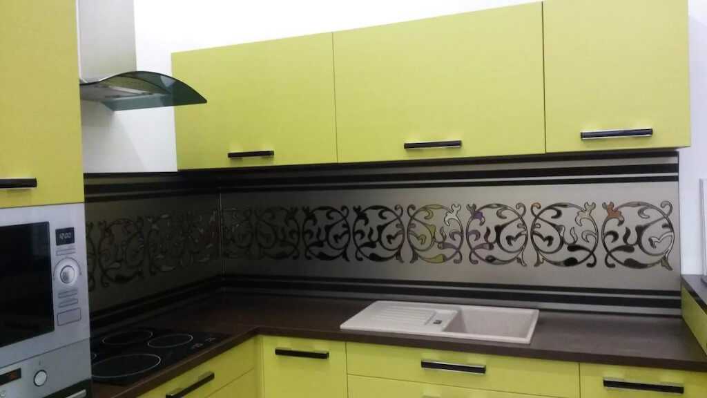 В интерьерах ряда стилевых концепций для декорирования и защиты зон над рабочими поверхностями уместно использовать тонированные стекла. Их цветовая гамма может быть разной, вплоть до черной.