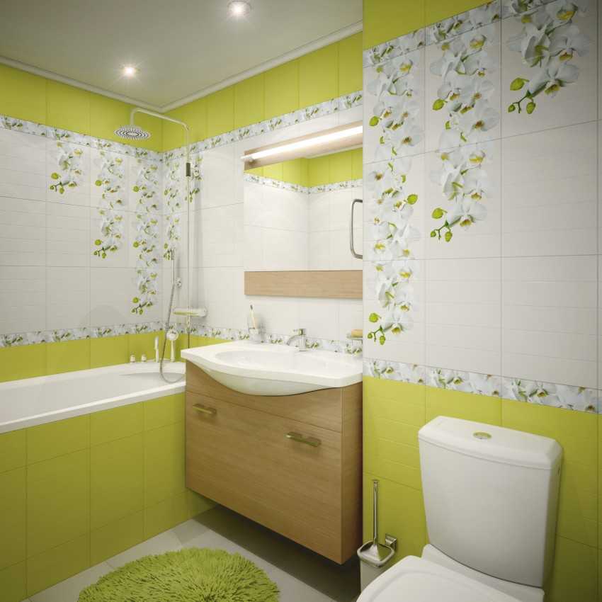 Лимонно-оливковые стены с декоративными вставками, в которых совмещены фоновые оттенки. Напольная плитка повторяет по тону одну из стен, а коврик перекликается с декором кафеля.