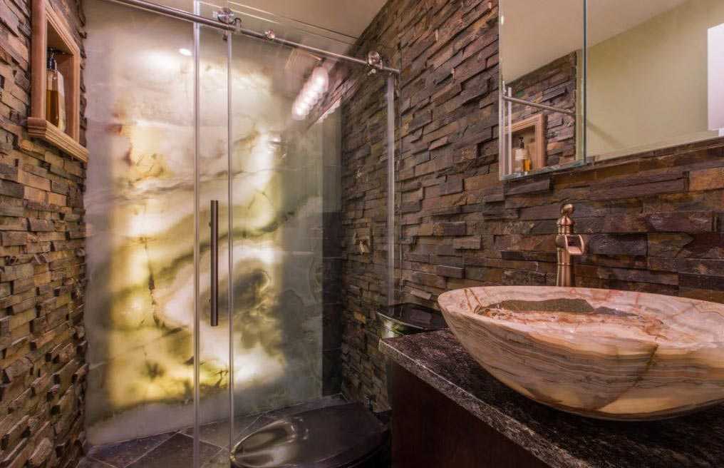 Для стенки душевой использован кафель с каменистой поверхностью.