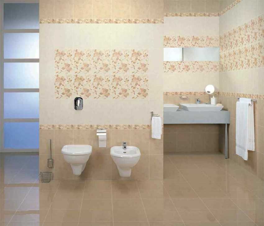 Стильно смотрится поверхность из светлого кафеля наверху с плитками на тон темнее внизу, разделенная по горизонтали декоративным узором. Причем на любом уровне. Комната кажется шире и просторнее.