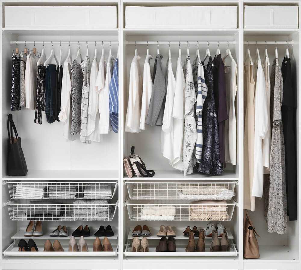 Порядок размещения одежды во внутреннем объеме шкафа-купе подчинен логике бытового комфорта. Верхний объем заполняется вещами, которые редко используются, – головные уборы, сумки, зонты, перчатки. Серединный предназначен для размещения одежды повседневной носки и вещей повышенной востребованности – платья, рубашки, брюки, юбки. Внизу шифоньера с тремя дверьми размещают габаритные и тяжелые вещи – сумки, портфели, обувь.