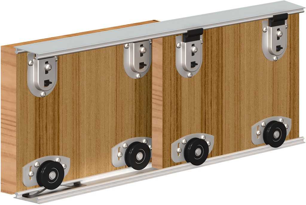 В первую группу входят конструкции, состоящие из верхнего и нижнего профиля, которые крепят внутри каркаса саморезами. В них монтируют ролики, перемещающие дверное полотно в разные стороны. Основная нагрузка приходится на нижний элемент. У подвесных створки крепят к торцу шкафа, что нагружает верхний профиль.