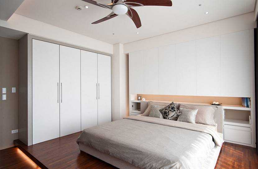 Оборудовать комнату для одежды и аксессуаров проще в вытянутой спальне. Но если нет возможности использовать много пространства, то лучшим выбором является встроенный шкаф.