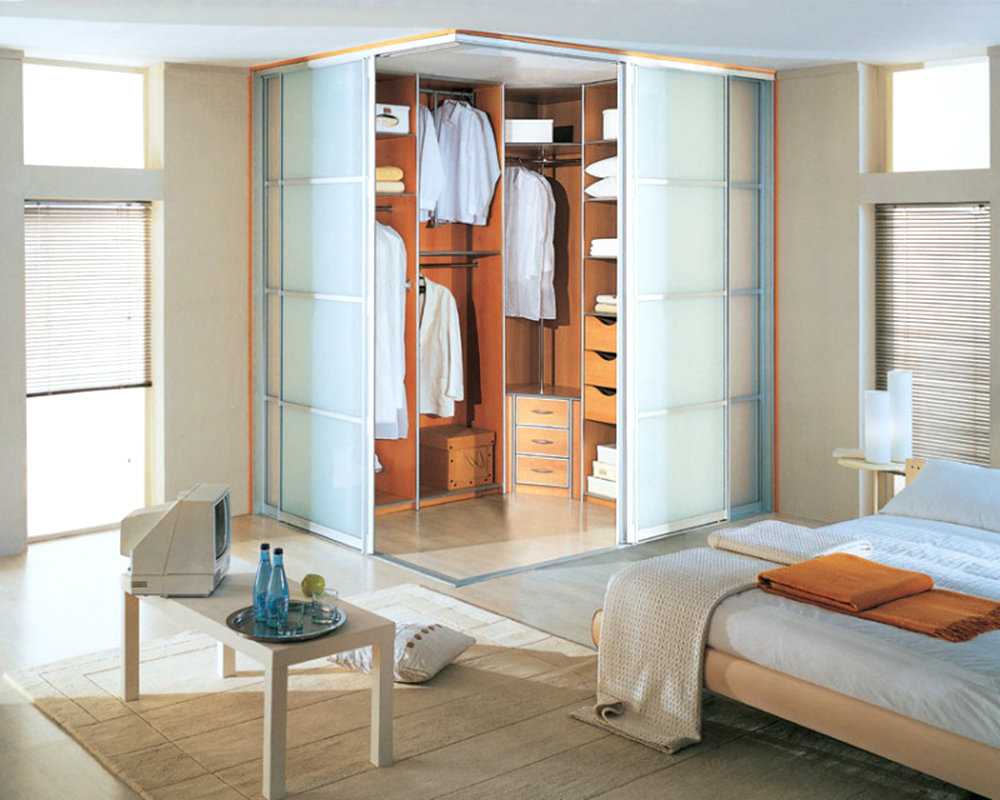 Угловой тип можно разместить как в спальне, так в гостиной – главное, правильно скрыть зону хранения одежды