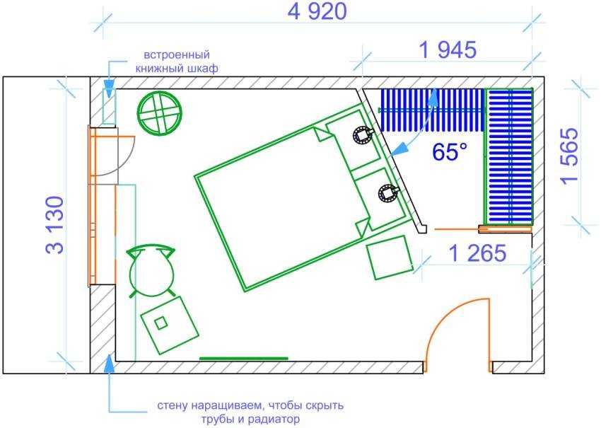При недостатке площади спальни и желании организовать гардеробную иногда разумно отделить в спальне треугольник для систем хранения одежды. Кровать будет стоять по диагонали, тогда центральная часть – стационарная стенка из гипсокартона, открываются только распашные дверцы по бокам кровати. Такой вариант дизайна угловых гардеробных комнат нередко заказывают в столярных мастерских индивидуально.