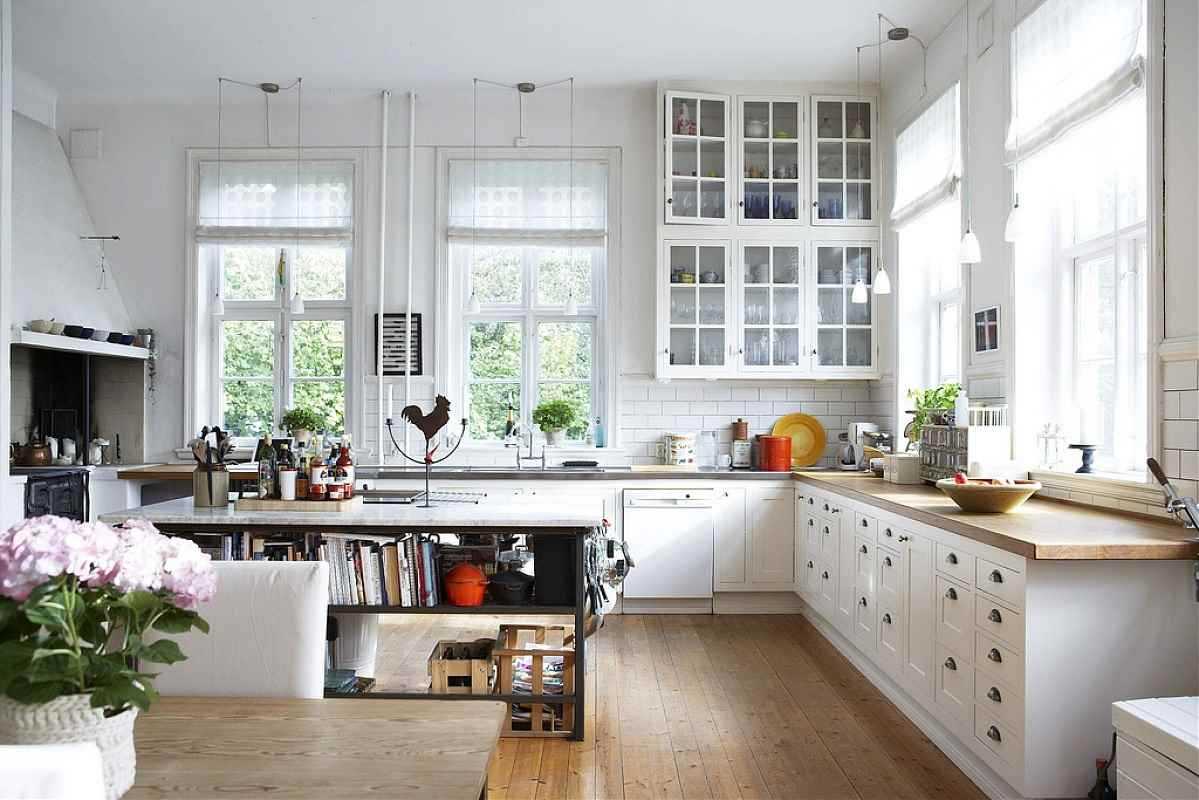 Окна и полки в скандинавской кухне заставлены милыми горшочками с комнатными растениями и аккуратными, преломляющими свет, стеклянными вазами. На окнах висят легкие прозрачные занавески, а стены украшены несколькими картинами и парочкой черно-белых семейных фотографий.