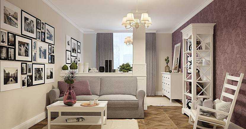 Картину над диваном можно заменить черно-белой широкоформатной фотографией, а вместо массивной люстры использовать современные светильники, стилизованные под классику.