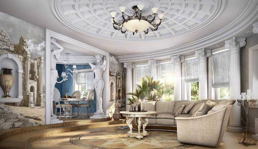 Шикарная гостиная в античном стилеИсточник Rehouz