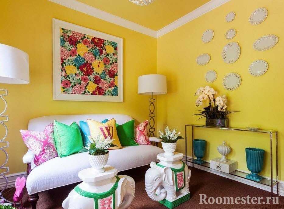 Чаще всего в яркий цвет выкрашивают только одну стену гостиной комнаты, в этом случае пространство не перегружается и не создается давящего ощущения. На контрасте с ярким цветом стены интересно будет смотреться светлая мебель.
