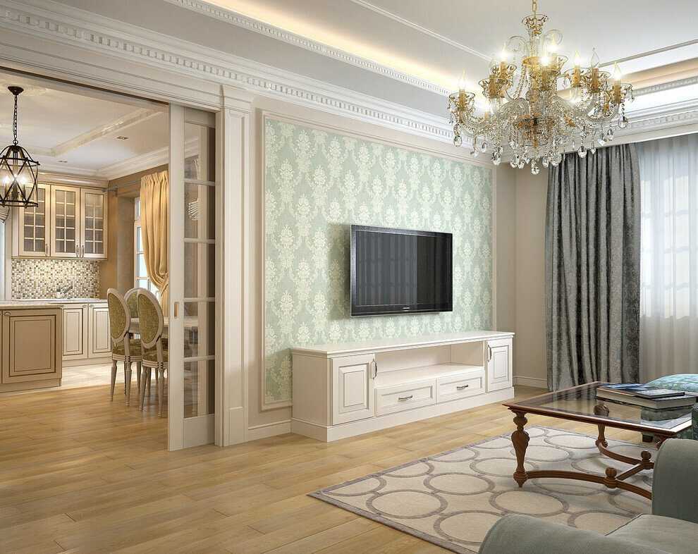 Светлые стены пастельных оттенков компенсируют средние размеры жилища. Кроме покраски, которая без молдингов будет выглядеть блекло, рекомендуется обратиться к обоям с мелким рисунком. Это могут быть текстильные, флизелиновые или бумажные разновидности, если вы планируете изменить дизайн через несколько лет.