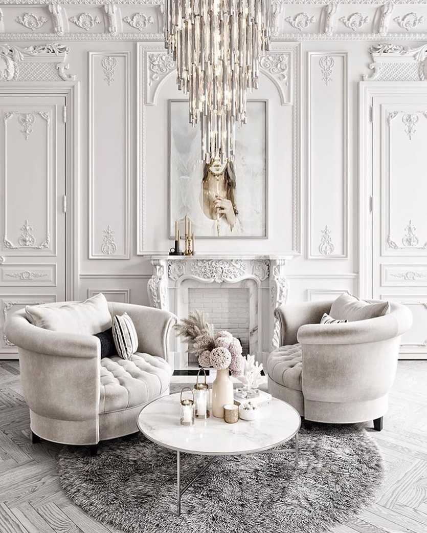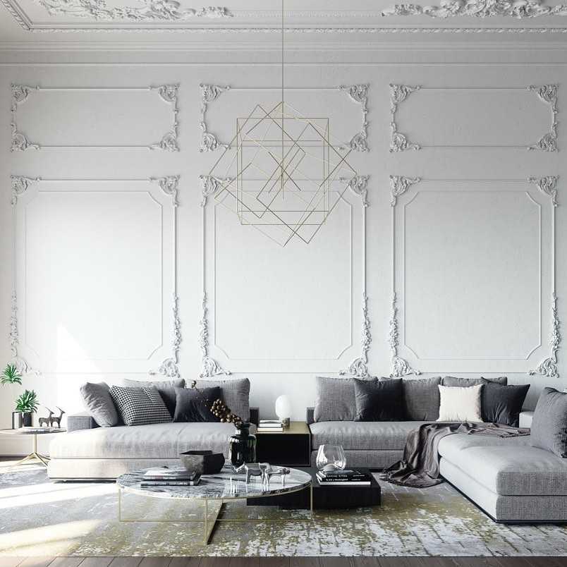 - Следование четким правилам расстановки предметов мебели и установки особых элементов. Проявляется в более сдержанной форме и адаптируется под современные потребности общества и тенденции. Применяются законы симметрии не только в размещении мебели, но и декора. Любые элементы (молдинги, панели, лепнина) приглушаются, чтобы выглядеть современно.