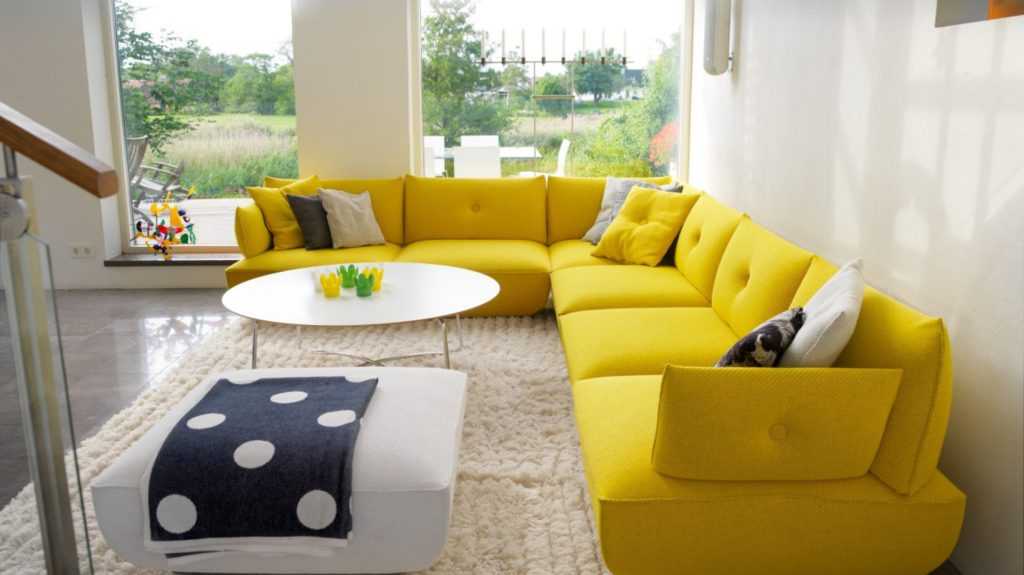 В современной гостиной желтый диван может сочетаться с несколькими цветами: