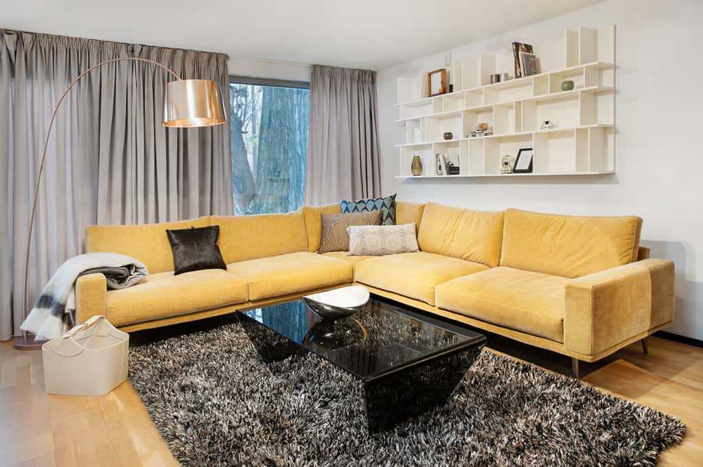 Желтый диван прекрасно сочетается с классическими деревянными полами. Ковры в комнате с желтым диваном должны быть простыми, однотонными в оттенках серого, с простыми геометрическими узорами и черными акцентами, что является идеальным вторичным цветом.