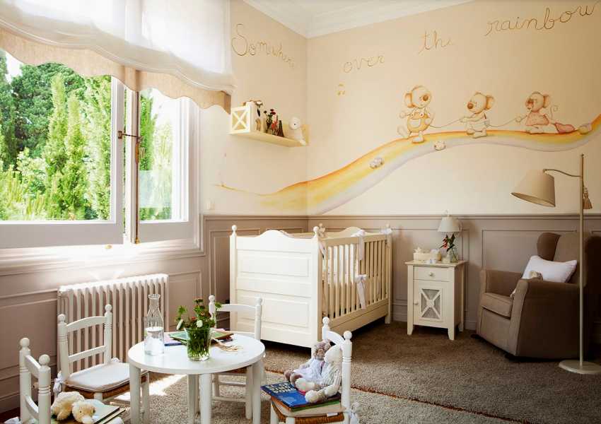 Для комнаты новорожденного выбирайте светлые, пастельные тона. Белый, бежевый, молочный – нейтральные цвета, на фоне которых отлично будет смотреться светлая мебель. Яркие цветовые акценты можно расставить с помощью нескольких игрушек, светильников
