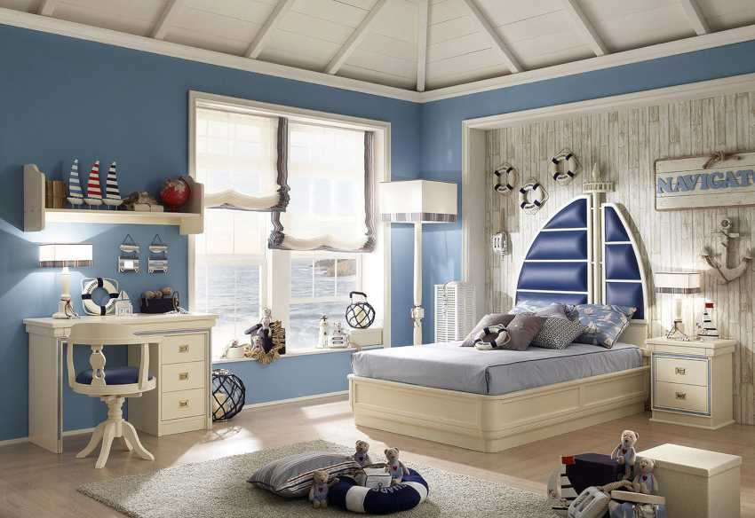 В комнате мальчика будут уместны не только голубой и серый – любые оттенки бежевого и коричневого, зеленого, синего можно выбрать для оформления детской комнаты дошкольника. Мальчишкам понравится морской дизайн детской комнаты, предполагающий сочетание белого или серого с синим цветом, допускающий красный в качестве цветового акцента.