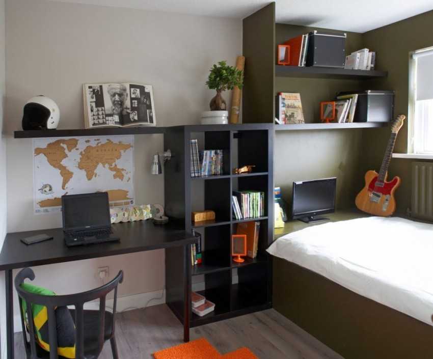 Если в жилом помещении лишь одна комната, можно приобрести компактный угловой компьютерный стол с надстройками в виде различных полочек и небольших ящиков. Еще одним вариантом рациональной планировки является расположение учебного места под кроватью-чердаком.