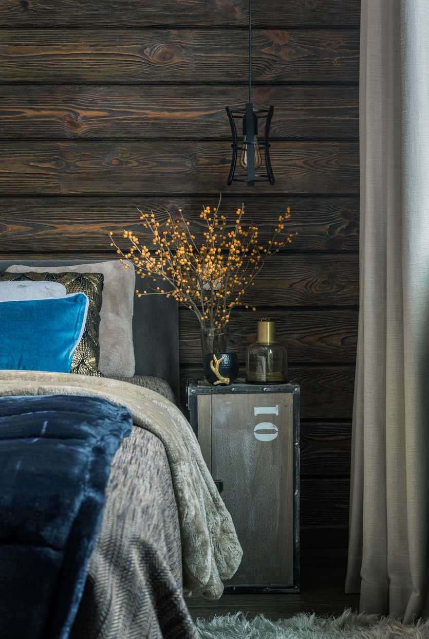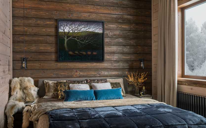 Если вы будете оформлять внутренние комнаты в стиле охотничьего домика, делайте акценты на мебели. Например, в спальню обязательно приобретите массивную двуспальную кровать, выполненную из грубо обработанной древесины. Цвета используйте преимущественно темные. Стены такой комнаты отдыха украшаются чучелами животных, оленьими рогами, ружьями и другими уместными элементами.