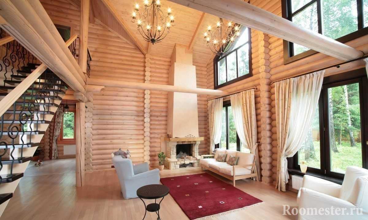 При строительстве сооружения из бревен, внутренняя планировка делается нестандартного исполнения. Сводчатые потолки, массивные потолочные балки перекрытия, а также лестница на второй этаж могут быть исполнены из цельного дерева, у которого предварительно удалена кора. Создайте сказочное оформление комнат.