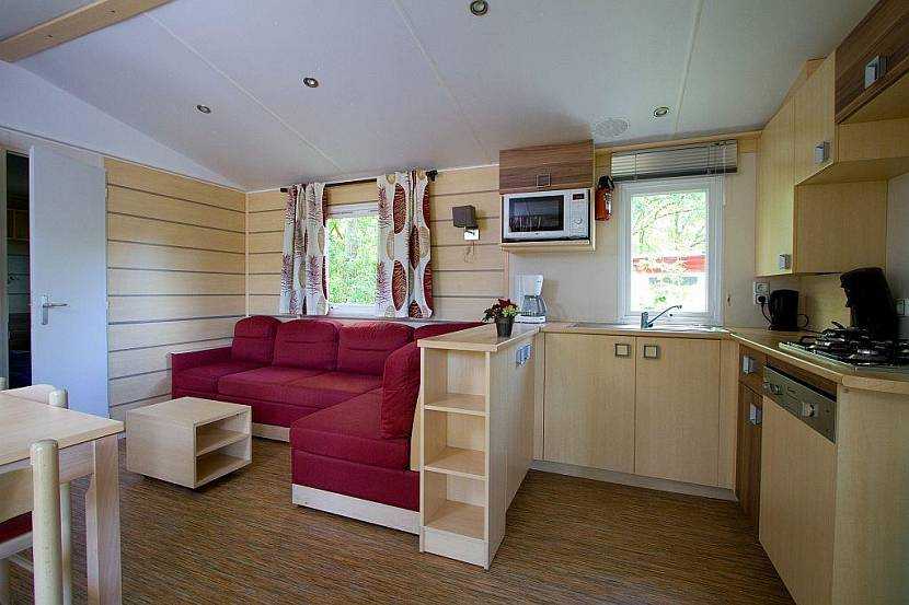 Одноэтажные домики с невысокой крышей часто приходится обустраивать в стиле квартиры-студии. Этот дачный интерьер из ряда «эконом». Поставьте П-образную кухню с несколькими шкафчиками и полочками, а рядом продумайте небольшой мягкий уголок. Последний может одновременно быть дополнительным спальным местом.