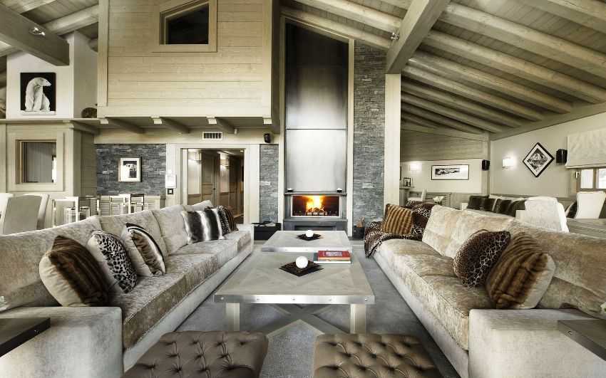 Швейцарский шале подразумевает минимум отделки. Стены либо штукатурят, либо обшивают деревом. Аналогично финскому варианту должен присутствовать камин, а в декоре используются картины с изображением природы, охотничьи аксессуары, шерсть, мех, кожа или лен.