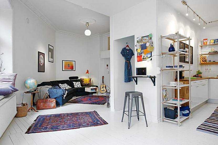 Здесь важно удачно совместить две противоположных задачи: обеспечить свободное пространство и с пользой распорядиться каждым сантиметром. Роскошный дизайн в маленькой комнате-студии будет явно не к месту, подойдут современные стили: минимализм, скандинавский, эко, хай-тек
