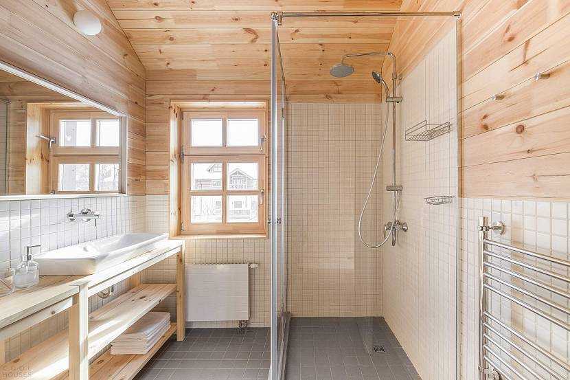 Полы душевой в скандинавском стиле отделаны серой некрупной плиткойИсточник coolhouses.ru