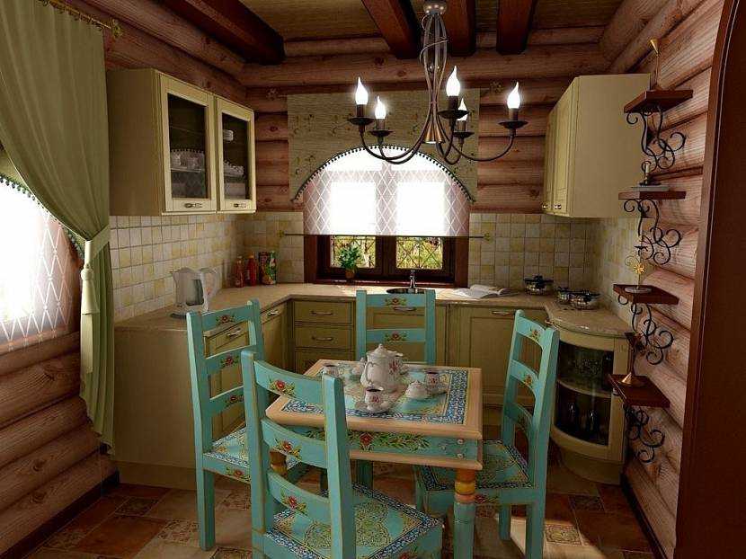 Практически каждый домик на даче не имеет отделки потолка. Она и не нужна в стиле «эконом». Видимые балки создают атмосферу незаконченной стройки. Укомплектованная кухонная мебель под окном и небольшой обеденный стол с расписными стульями — современная идея со старинным смыслом.
