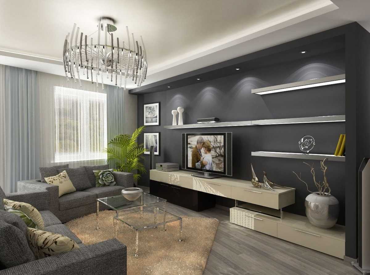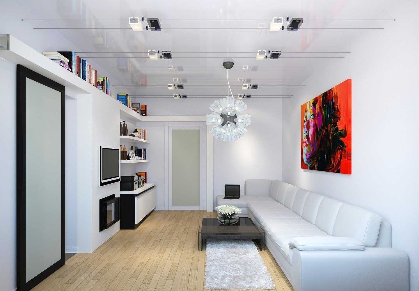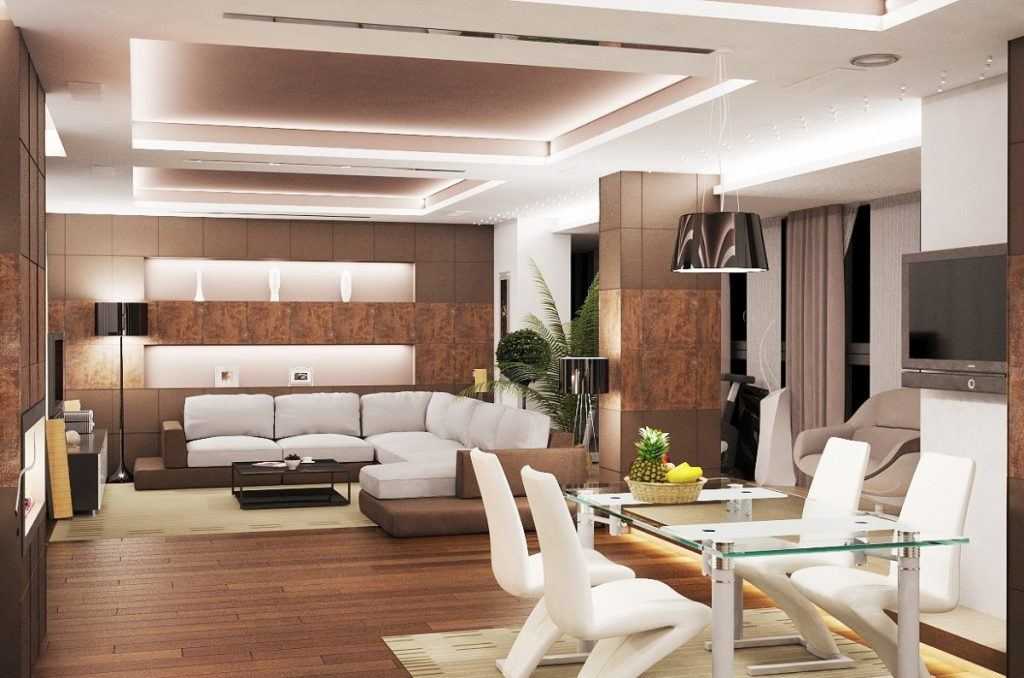 Оформление потолочной зоны зависит от высоты стен и имеющейся площади зала. Чем ниже и меньше комната, тем проще отделка потолочной зоны. Чтобы визуально сделать комнату больше, можно использовать глянцевые поверхности, которые присущи натяжным потолкам.