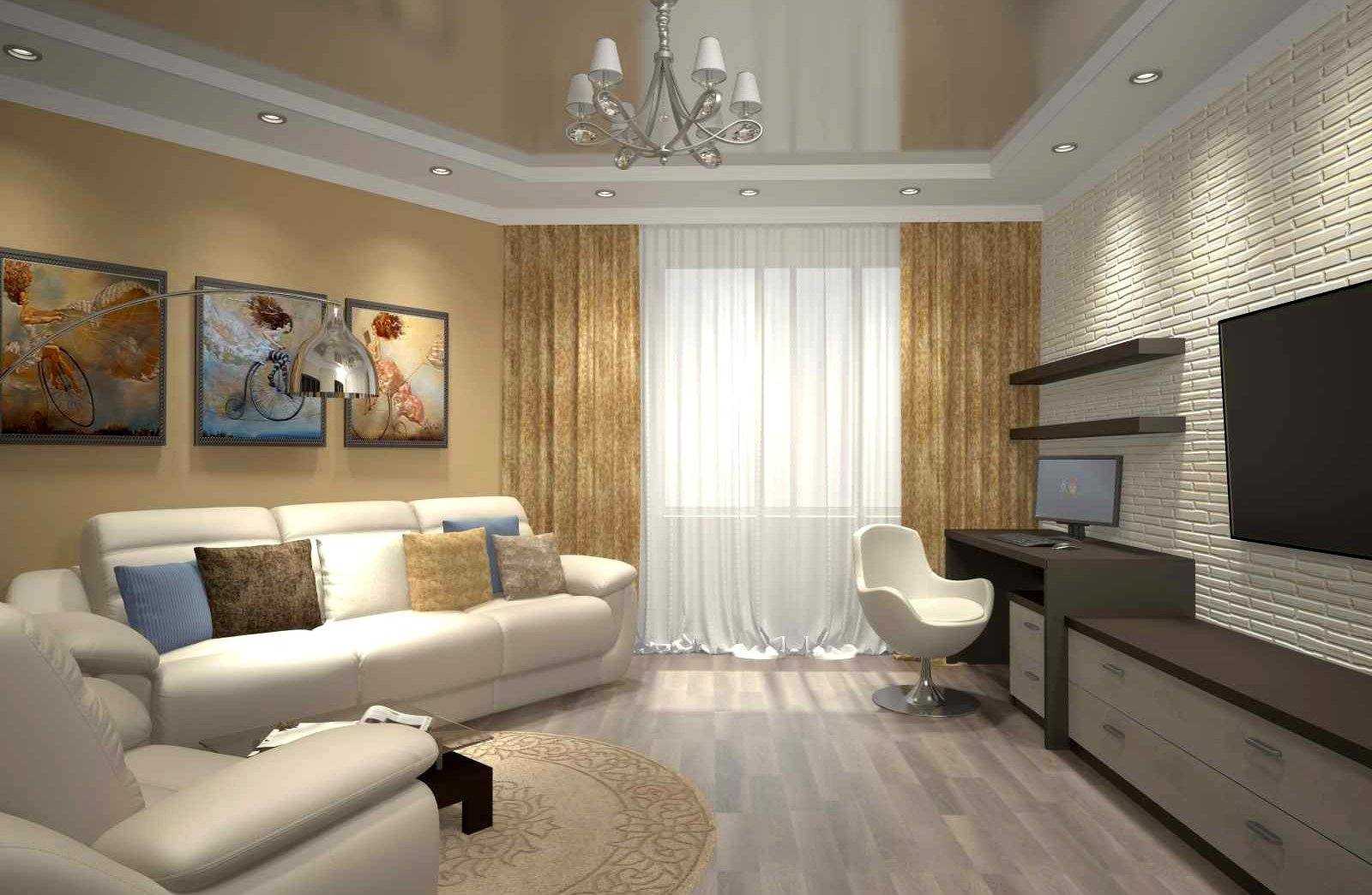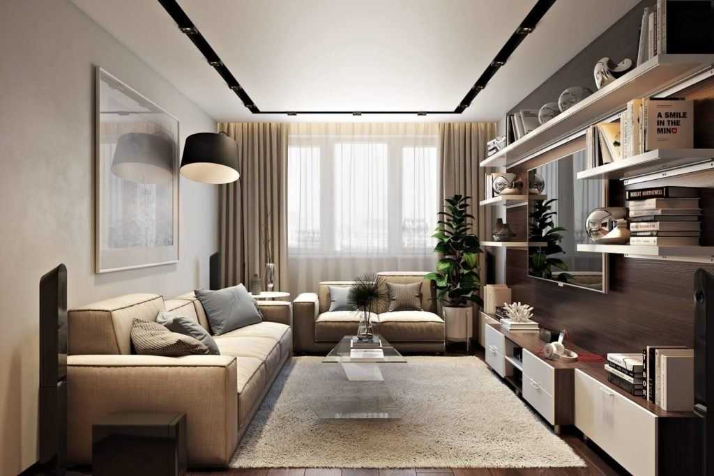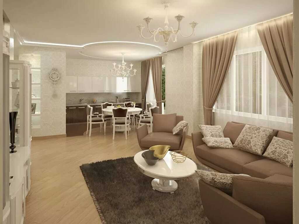 Дизайн гостиной комнаты выполнен в бежевом цвете
