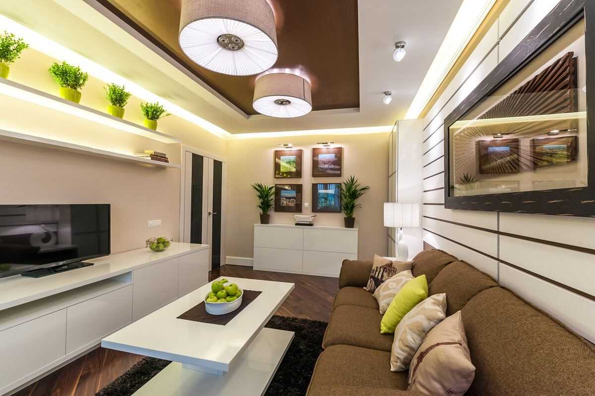 Выбор нужного материала поможет подчеркнуть положительные стороны помещения и спрятать недостатки. К примеру, для маленькой гостиной часто используют натяжной глянцевый потолок из-за его свойства иллюзорно увеличивать размер помещения. Для большого зала подойдут многоуровневые конструкции, благодаря которым можно разделить визуально комнату на зоны.