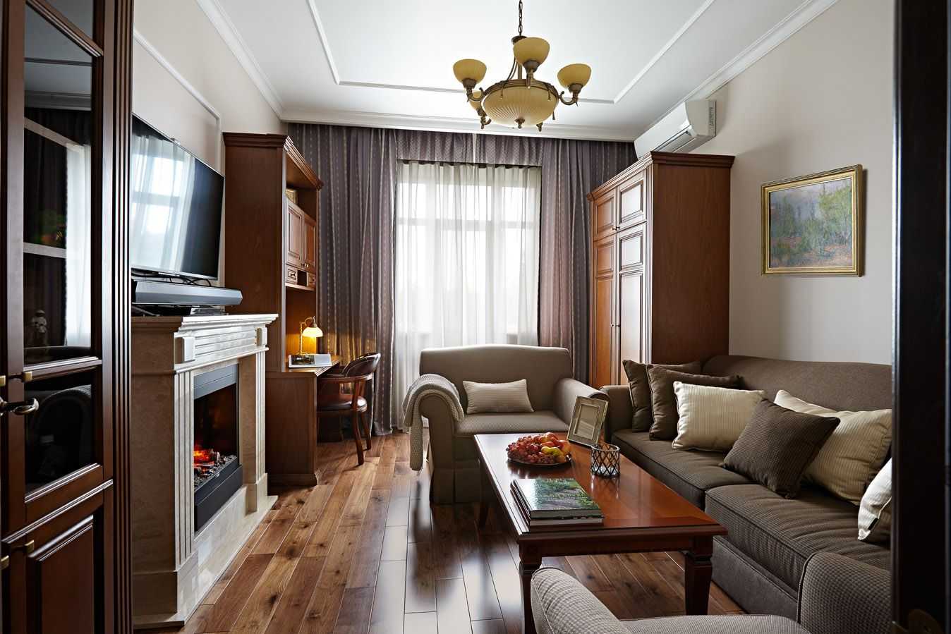 Классический вариант стен в компактной комнате относится к единой цветовой гамме. Допускается присутствие небольшого камина. Вокруг камина все должно быть максимально светлым.