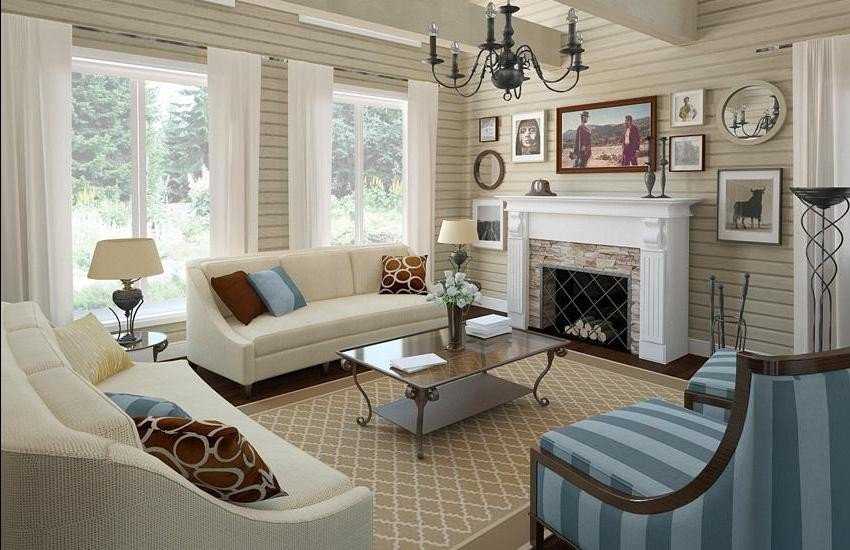 Мебель для кантри выбирают простую, грубоватую и добротную. В гостиной будут уместны кованые столы и плетеные кресла. Элементы декора используются по минимуму. Если дом деревянный, то на отделке потолка и стен «экономят», предпочитая сохранить рисунок натурального дерева. Полы покрывают мягкими коврами и плетеными дорожками.