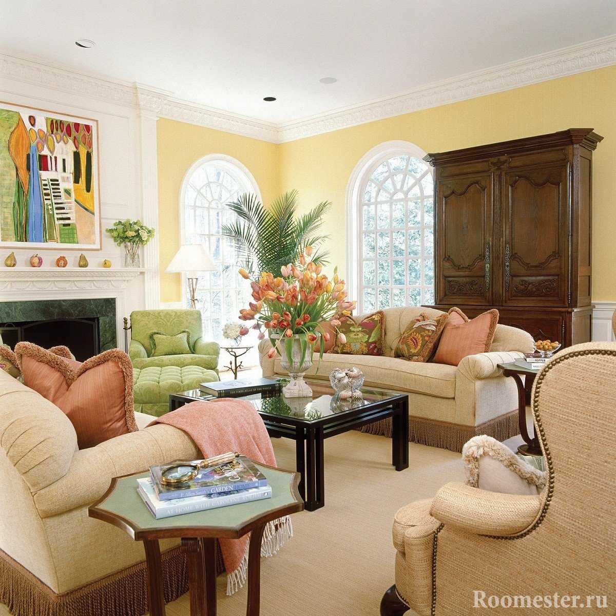 Цвета гостиной комнаты зависят в первую очередь от ее размера. В небольшом интерьере подойдут светлые цвета, которые визуально увеличат пространство. Эффект простора будет также усилен хорошо подобранными красками — сатиновые и керамические эмульсии слегка блестят и лучше отражают свет, некоторые краски имеют специальный оптический маркер, а отделки с металлическим эффектом также добавляют глубину. Избегайте больших узоров на обоях и занавесках на небольшой площади, поскольку они могут уменьшить интерьер.