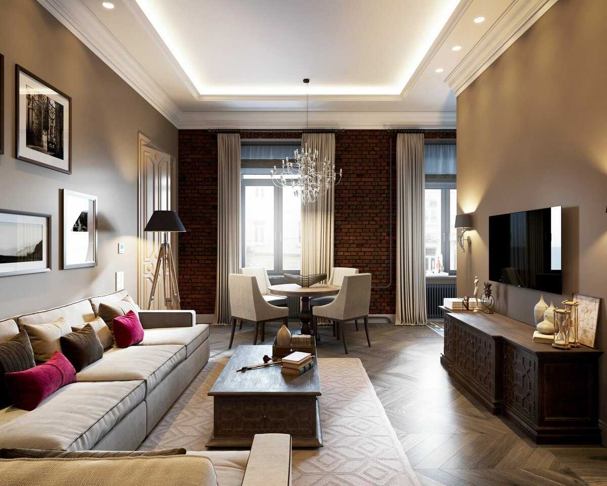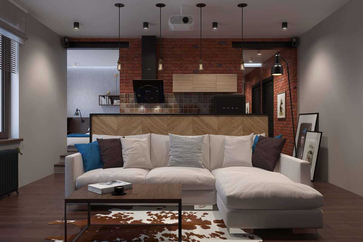 Одна стена из кирпича в стиле лофт «не съест» много пространства, если правильно учесть перспективу. В удлиненной комнате эту стену размещают напротив окна, чтобы она была максимально освещена естественным способом.
