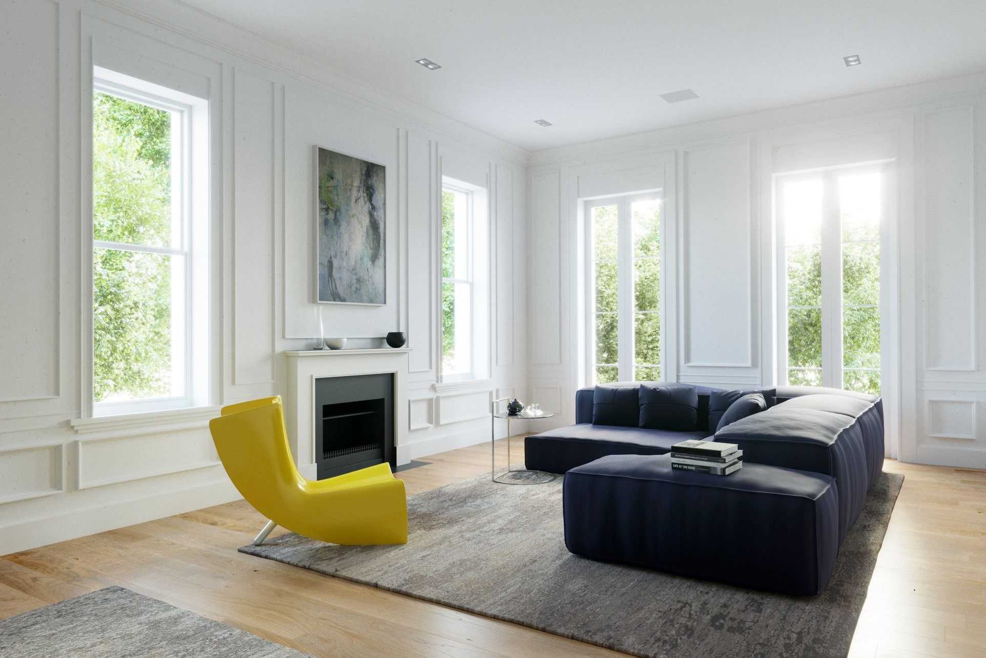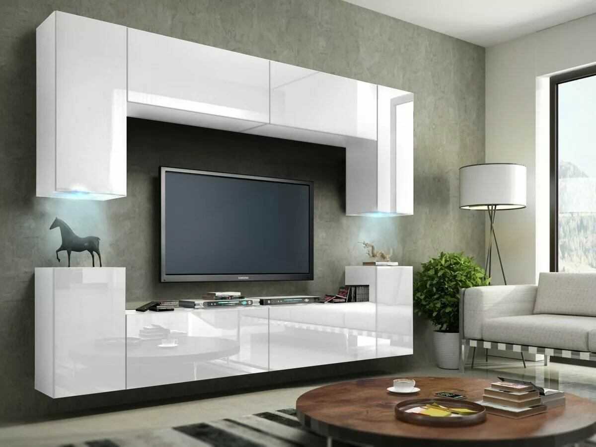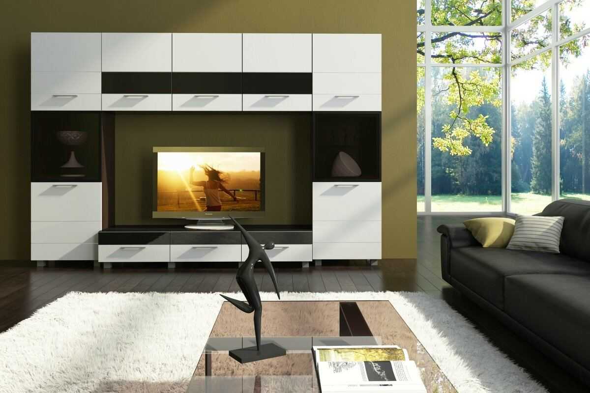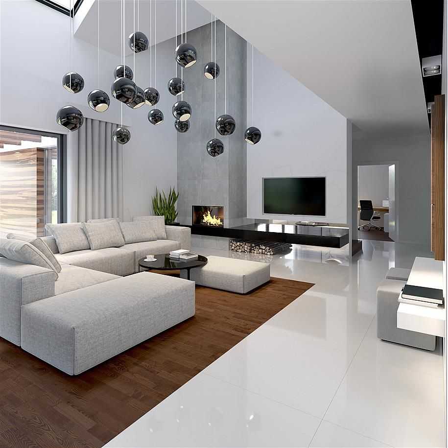 Современные гостиные отличаются высоким монохромным оттенком. Наиболее популярным является контрастное сочетание белого и черного или объединение цвета мебели, стен и полов — здесь также выбор обычно падает на белый. Диапазон смелых решений включает, среди прочего, стены в очень темном цвете, сочетание кирпича на стене с глянцевой поверхностью пола, стен или столешниц.