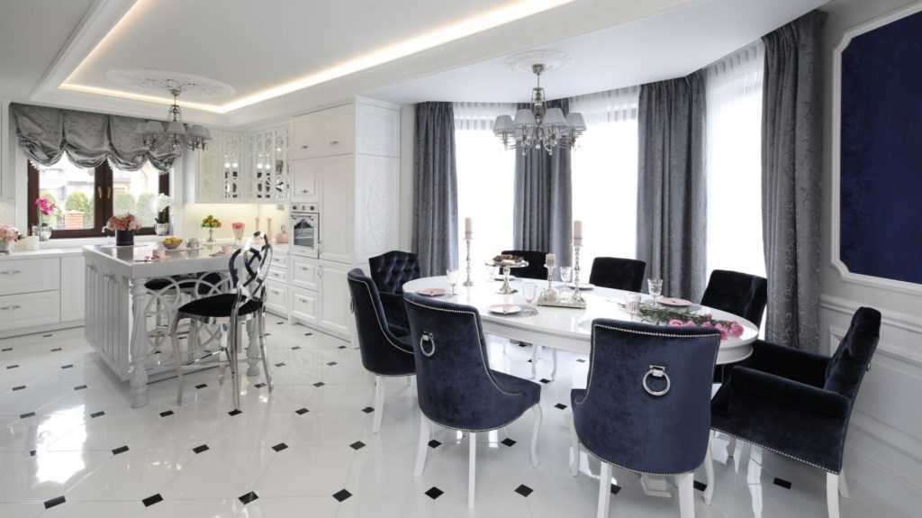 Современный стиль любит противоположные цвета. Расцветки, такие как чернила, маренго или сапфир, соответствуют белому. В общем, серый или гранат будет хорошо смотреться. Стены могут оставаться полностью белыми, что еще больше осветляет интерьер.