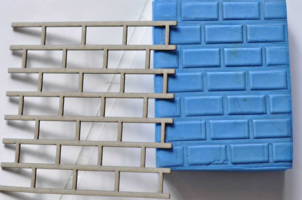 Пенополистерол нарезают на плиточки нужного размера толщиной 1 см. Для большей похожести, края оплавляют огнем. Вместо оплавления, можно потереть каждую плитку наждачной бумагой в разных местах, добиться шероховатости, вмятин и бугорков.