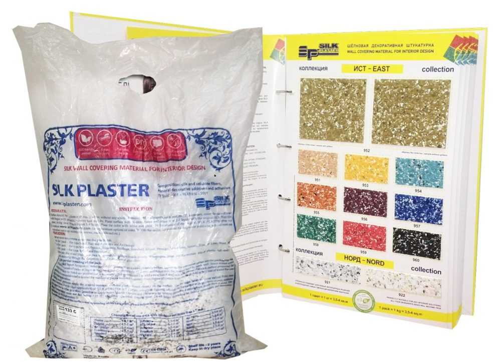 Еще одним популярным брендом является Silk Plaster. Это безопасные составы, устойчивые к температурным/влажностным перепадам и высоким нагрузкам. Продаются такие составы полуготовыми – их нужно просто развести водой и дождаться намокания волокон. Минус – это меньший выбор цветов, чем у описанных выше производителей.