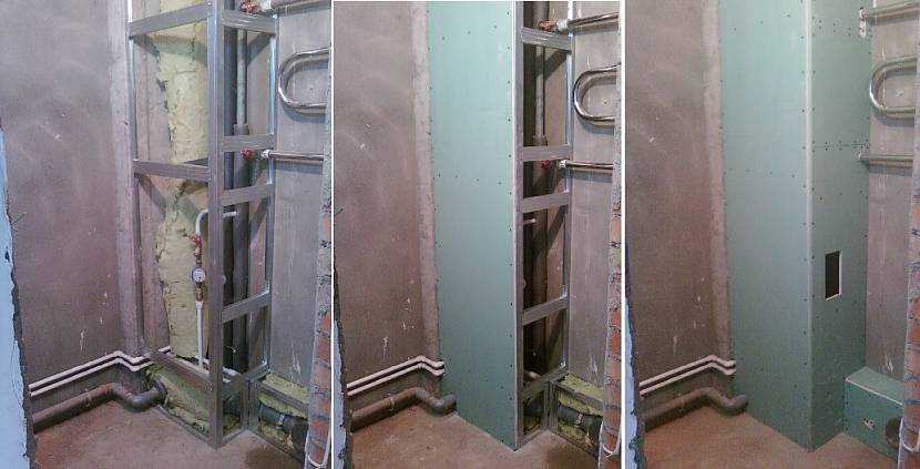 Для изготовления короба, скрывающего канализационные стояки понадобится использовать направляющий профиль. Он будет служить креплением конструкции к основам. Для сооружения основного каркаса достаточно будет обычных профилей. В области узла, который подлегает обслуживанию, оставляют люк. Он обеспечит легкий доступ к коммуникациям.