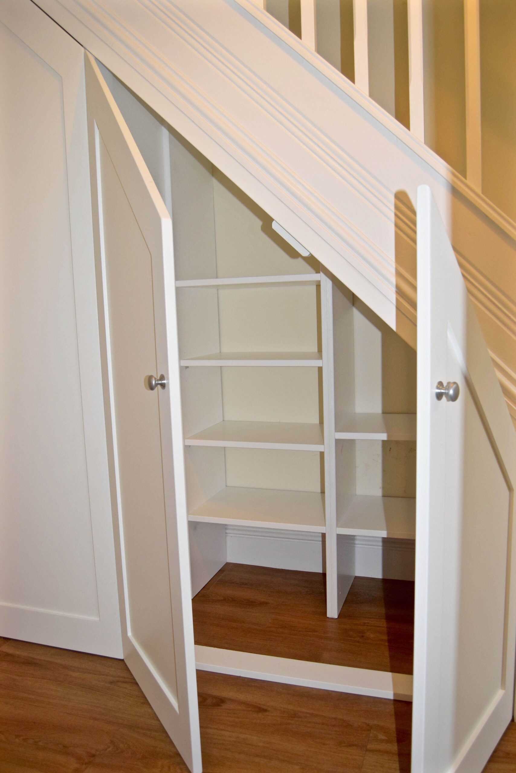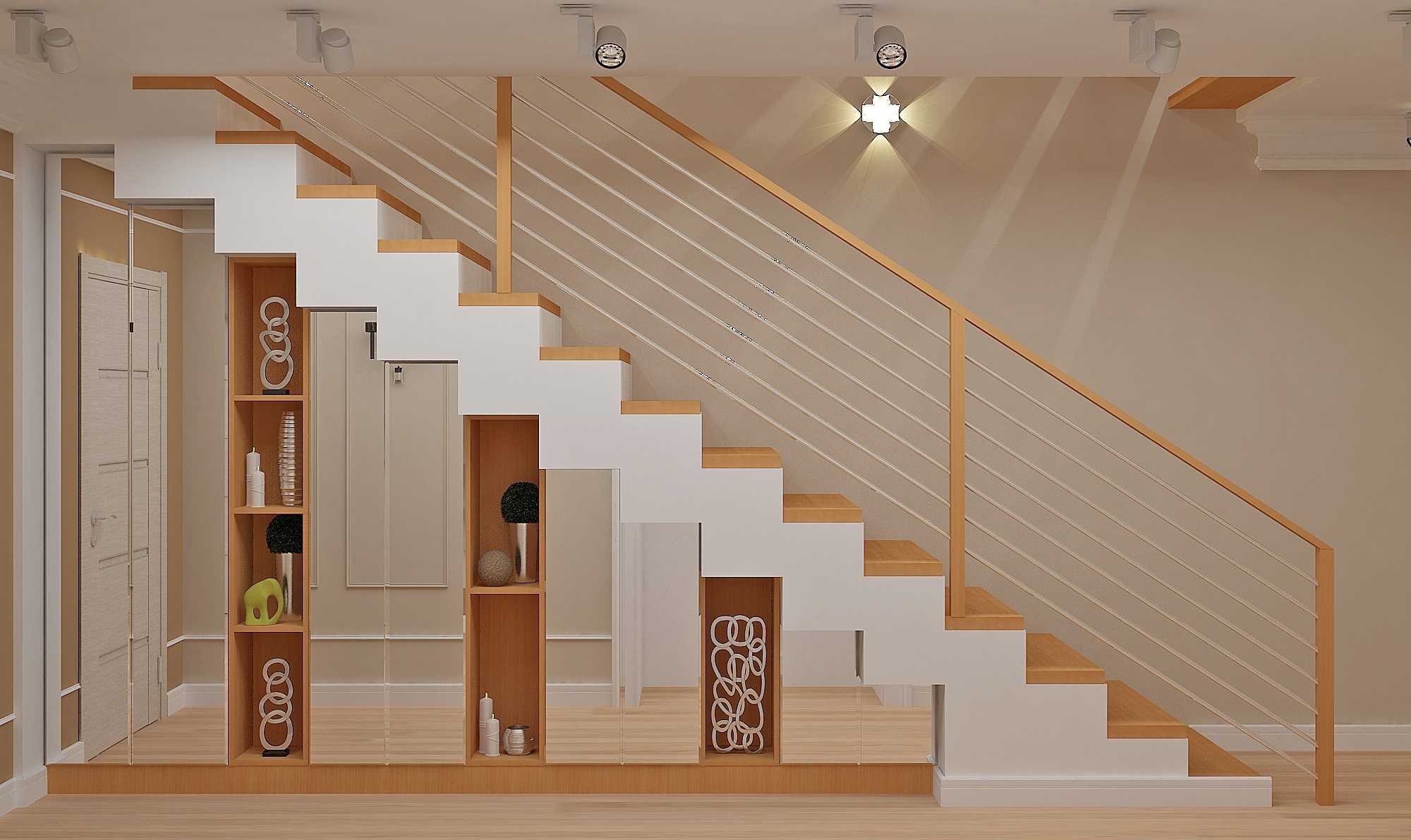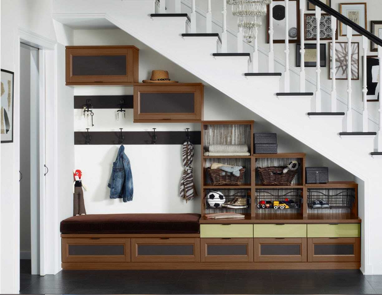Шкаф, находящийся рядом с лестницей или под ней, — это практичное, удобное решение. Существуют несколько видов подобных конструкций: