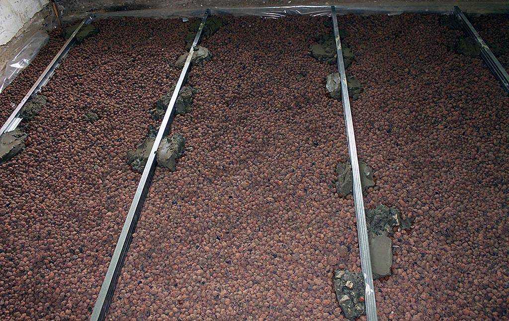 Сама стяжка может быть исполнена из разного материала. Признанный лидер в этом – керамзит: лёгкий, имеющий разные размеры элементов, которые можно выбрать исходя из поставленной задачи и площади пола. При его использовании чаще всего применяют маяки из деревянных брусков сечением 50 х 50 или 50 х 60 мм. Сам керамзит лучше выбирать с размерами частиц 10-12 мм, как обеспечивающий более ровную поверхность.
