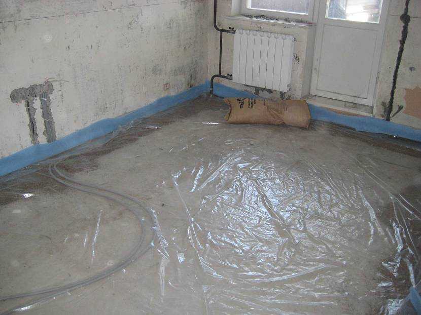 Во влажном помещении при любом выравнивании наносится слой гидробарьера обмазочного типа. Дополнительно под раствор можно уложить полиэтилен с заходом на стены высотой, равной толщине стяжке. Швы между полотнами образованы нахлёстом на 20 см, их обязательно герметизируют путём проклеивания сантехническим скотчем или универсальным двухсторонним (самый надёжный – на битумной основе). По периметру прокладывают демпферную ленту.