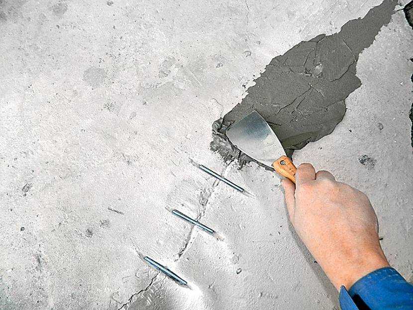 Все повреждённые участки необходимо подготовить к реставрации. К таковым относятся трещины на бетоне. Их нужно расшить, обеспылить, обработать грунтовочным составом. В завершение заполнить ремонтным составом. Для профилактики дальнейшего расширения бетона поперёк шва формируют углубления под армирующие стержни.