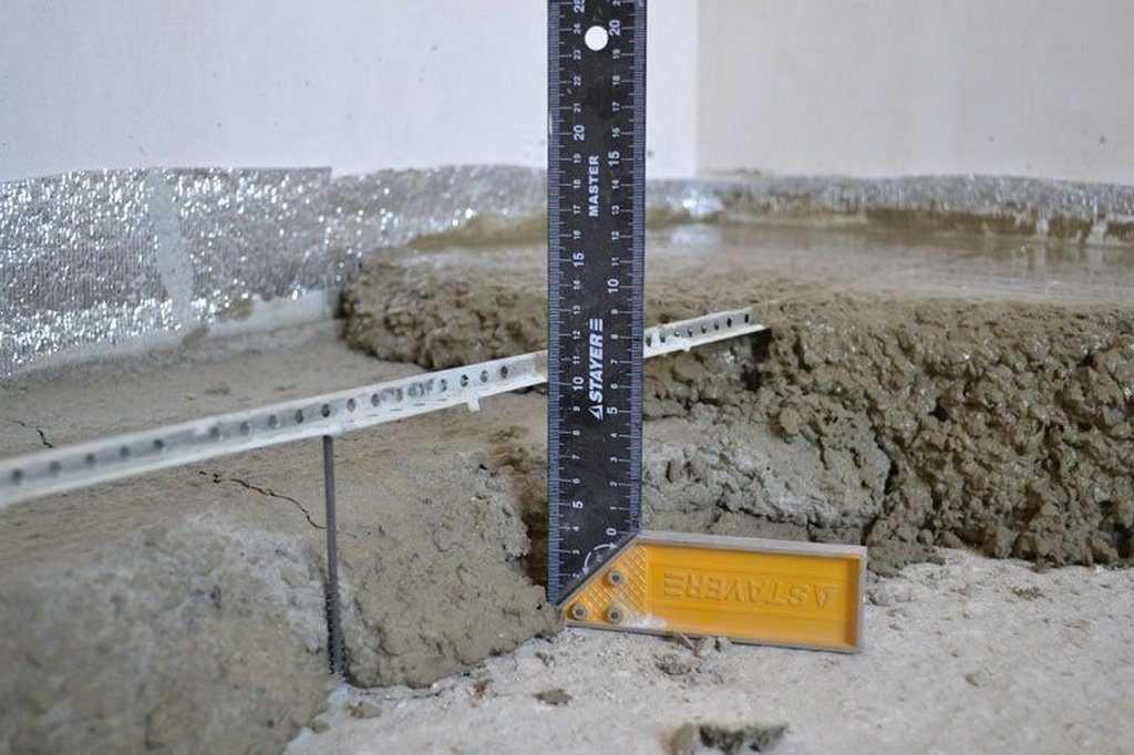Здесь кроме рельефности чернового основания необходимо учесть высоту выравнивающего состава. Например, сухая стяжка из керамзита может составлять 40 см, а цементный раствор всего 3 см. То есть окончательный результат под установку маяков будет выше ориентира на высоту ровнителя.