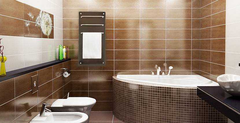 Если приходится облагораживать совмещенный санузел, то в моде будет мозаика красно-оранжевого цвета. Такой стиль обычно используется для декорации некоторых функциональных зон: ванны, душа, умывальника, туалета. В остальном коричневый кафель в полстены и верхняя облицовка пластиковыми панелями — идеальный вариант.