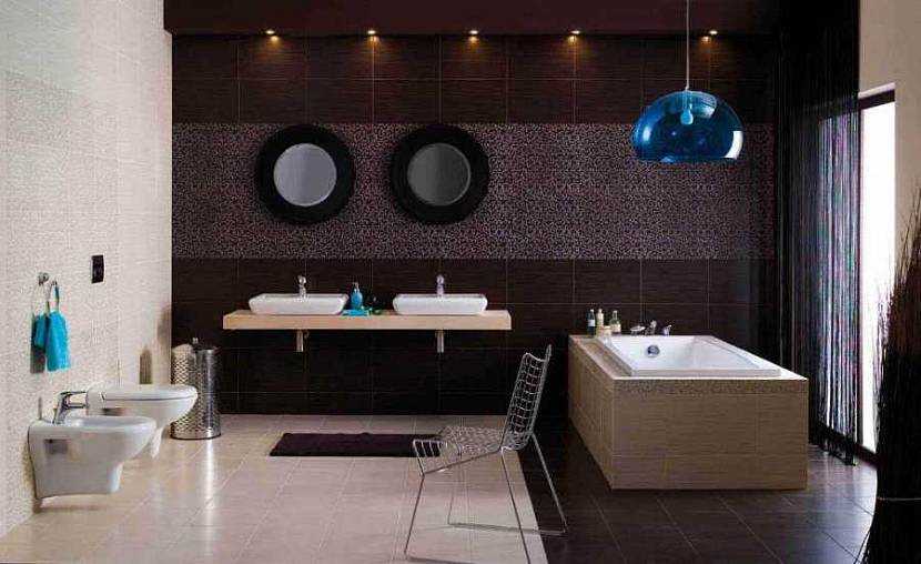Помимо этого, обстановка в ванной будет смотреться несколько угнетающе. Однако существует и третий вариант – комбинированный. Например, если выбрать коричневый тон и разбавить его светлыми оттенками, то на контрасте можно сделать целые композиции, которые будут смотреться весьма гармонично. Такой способ отличают, как правило, темный пол, а также светлые стены и потолок.